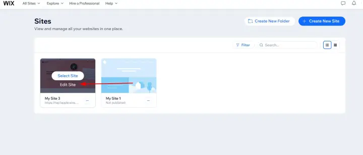 Select the site you want to edit and click Edit Site to open the Wix Editor.