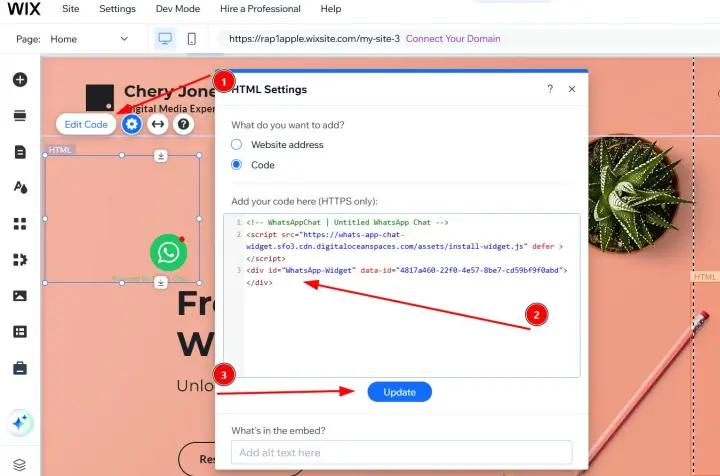 Paste your WApp Chat installation code into the pop-up window and click Update.
