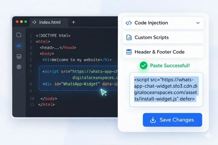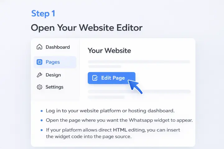 Adding a WhatsApp chat widget to your website only takes a few minutes and requires minimal technical knowledge. Once installed, visitors will be able to contact you instantly through WhatsApp from any page of your site. This guide works for most website platforms that allow you to edit HTML or insert custom code.