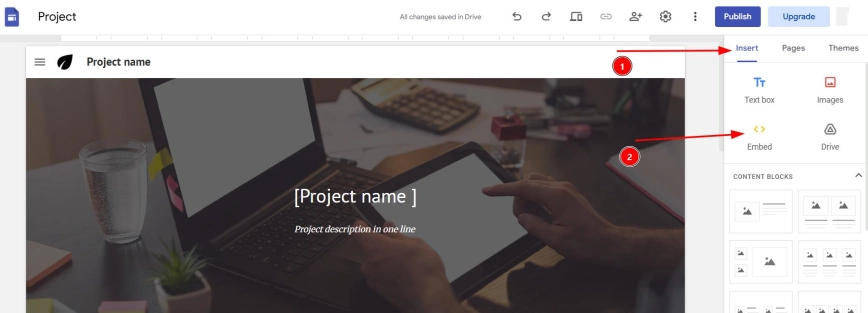 To get into the page editor, click "Insert" and then select the "Embed" button.