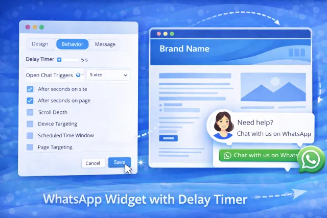 A WhatsApp widget with delay timer is a website chat widget that waits a set number of seconds before appearing or opening on the page.