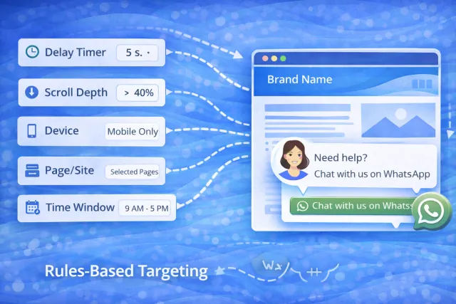 Suggested image placement: wide rectangular image showing rules-based targeting — timer, scroll, device, page, and time-window settings — connected to one polished WhatsApp widget preview.